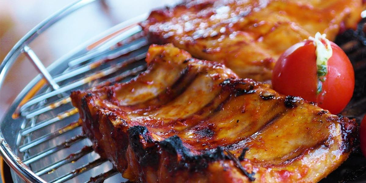 mit Spare Ribs, pikanten Pulled Porked und würzige Chicken Wings, Kartoffel Wedges und Ofenkartoffeln sowie passende Dips, verschiedene Salat und Gemüse
